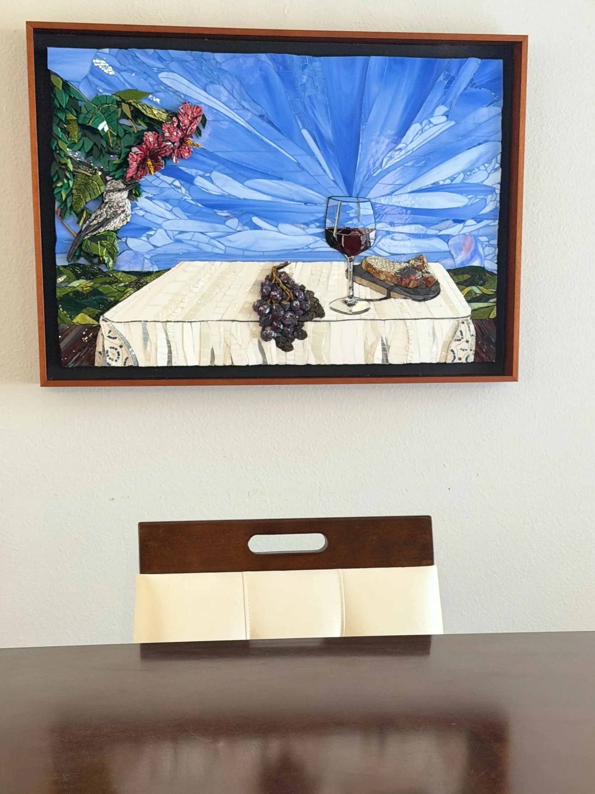 Commissioned mosaic artwork in relief, 20” x 30” (4.15 square feet), horizontal format. Created using mixed materials such as glass, smalti (Mexican and Italian), and filati (hand-pulled smalti threads created by the artist) on Kerdi Board.